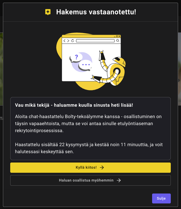 chat-keskusteluun. Haastattelukutsu näyttää hakijalle tältä: