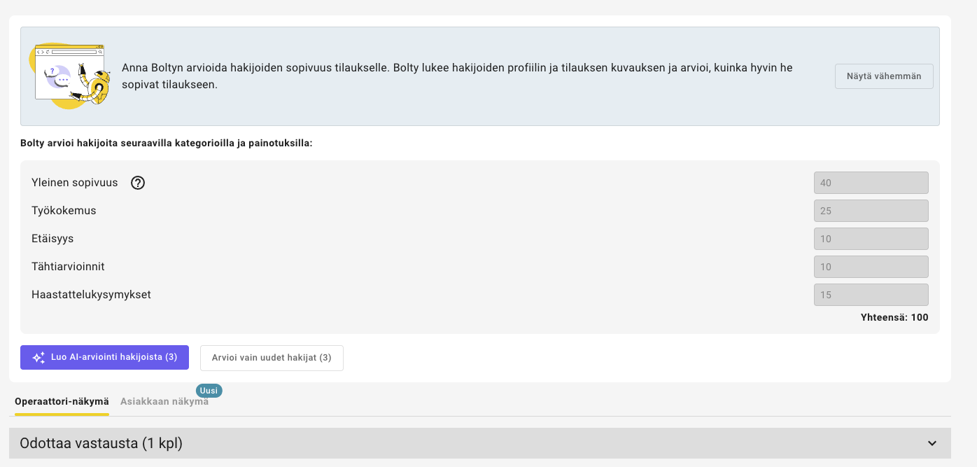 Pilotin tekoäly-tilauksilla on uusi osio, jossa tilaukselle hakeneet henkilöt on arvioitu
