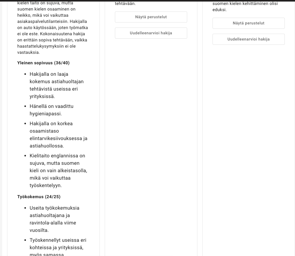 Tekoälyn arviointi-osiossa (tekoälyn arviointi on konsepti, josta voisi erikseen kertoa halutessaan. Esim. mistä löytyy, mitä sisältää, mitä tarkoittaa.) hakijat on pisteytetty ja järjestetty pisteytyksen mukaan. Lisäksi kunkin hakijan kortin alareunasta löytyy sanallinen yhteenveto hakijan soveltuvuudesta.